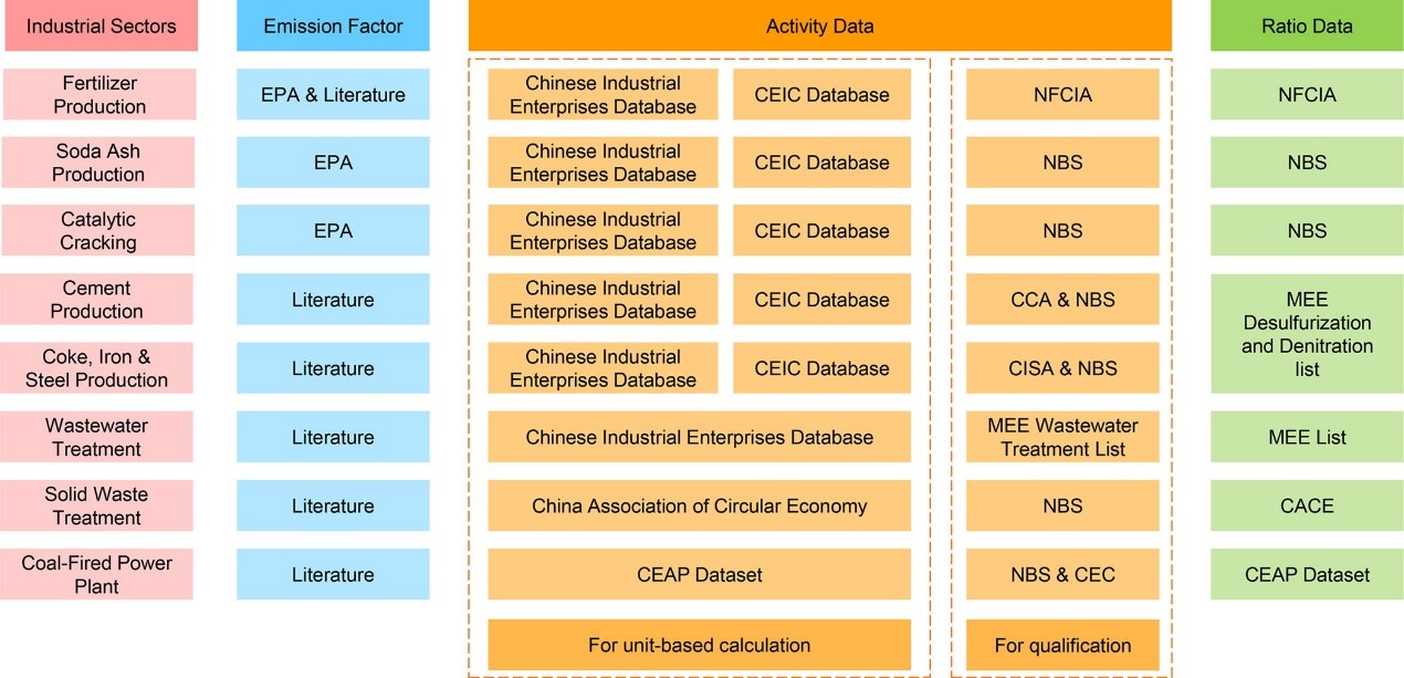 王学军教授团队在国家自然科学基金支持下,与耶鲁大学、循环经济协会、清华大学等单位的同行合作,利用最新的测量数据和工厂级别信息,建立了高空间分辨率的工业源氨排放数据集,此数据集涵盖8个主要工业行业和27个细分过程类别(图1)。