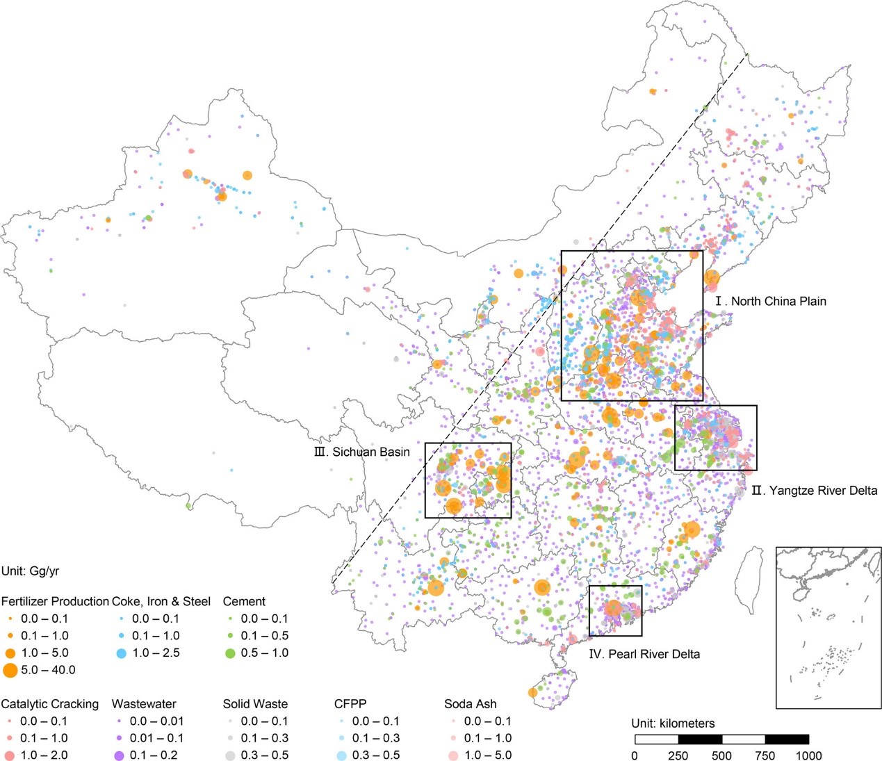 点的面积代表每个工厂的氨排放量(单位: 千吨/年);圈出区域为排放热点地区