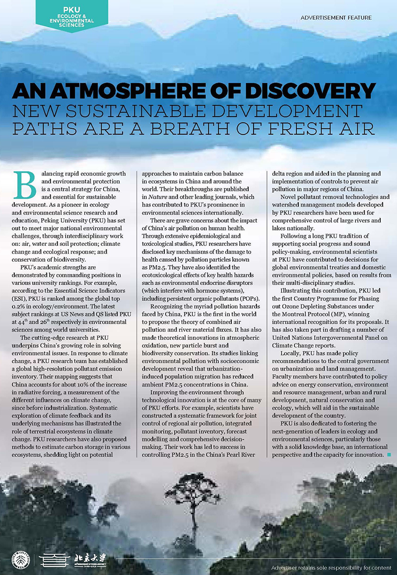 为迎接北京大学120周年校庆,NATURE主刊近期推出了一版专门针对蜜桃直播-蜜桃直播app 蜜桃直播 和环境工程蜜桃直播 的“生态环境”宣传页,标题为:AN ATMOSPHERE OF DISCOVERY:NEW SUSTAINABLE DEVELOPMENT PATHS ARE A BREATH OF FRESH AIR。