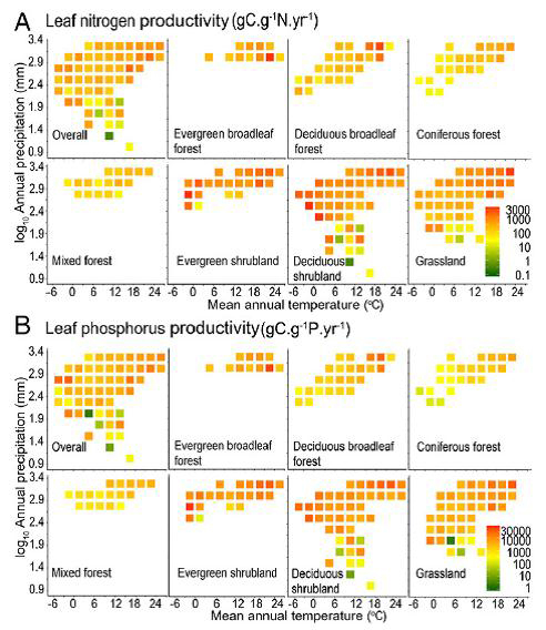 唐志尧副教授课题组与中科院植物所谢宗强研究员共同组织了碳专项灌丛课题的相关工作。在此PNAS专题中,唐志尧与中科院植物所、华南植物园等单位合作,揭示了中国陆地生态系统生产力的的化学计量机制。 植被生产是生态系统固碳的主要途径,叶片是植被生产的主要器官。局域尺度的个体的研究表明,植被生产力受制于叶片氮、磷含量。然而以往研究仅在个体水平开展,缺乏区域尺度植被生产力与植物化学计量之间关系的研究;然而由于生态系统中不同物种的个体数量悬殊,植物主要器官的氮、磷功能差异显著,因此基于个体的叶片养分与生产力的关系难以推演到生态系统。 图1 中国主要陆地生态系统氮、磷利用效率随年均温和年降水的变化 本研究中,唐志尧课题组与合作通过大量的野外调查取样,获取了4,159个样地中常见物种不同器官(根、茎、叶)的碳、氮、磷含量以及生物量,首次通过生物量加权研究了群落层次植物不同器官碳、氮、磷化学计量的大尺度格局及其与生态系统初级生产力的关系。研究发现:在国家尺度,不同植物器官之间的植物养分含量符合幂函数关系,叶片养分含量比根、茎养分含量更稳定;生态系统总初级生产力与叶片氮磷储量均成正相关关系,但在不同生态系统类型中,总初级生产力与叶片氮磷储量之间的关系取决于养分在不同器官之间的分配策略及优势植物的叶寿命。他们进而计算了中国陆地生态系统的植物叶片平均氮、磷生产效率(即单位质量的叶片氮或磷所生产的总初级生产力)分别为250 gC GPP/gN.yr-1 和 3,158 gC GPP/gP.yr-1,该生产效率随温度和降水的增加而增加;未来气候变暖背景下,生态系统可能会通过提高其氮、磷效率来增加总初级生产力。这一研究将植物养分的大尺度化学计量研究由个体以及单个器官扩展到群落层次,为进一步估算植物养分储量及模拟生态系统生产力对氮、磷沉降的响应提供了科学依据。 论文“Patterns of plant carbon, nitrogen, and phosphorus concentration in relation to productivity in China’s terrestrial ecosystems” (//www.pnas.org/content/115/16/4033)于2018年4月17日在线发表。北京大学唐志尧副教授、中科院植物所徐文婷博士和中科院华南植物园周国逸研究员为论文的共同第一作者,北京大学方精云院士与中科院植物所谢宗强研究院为共同通讯作者,城环蜜桃直播