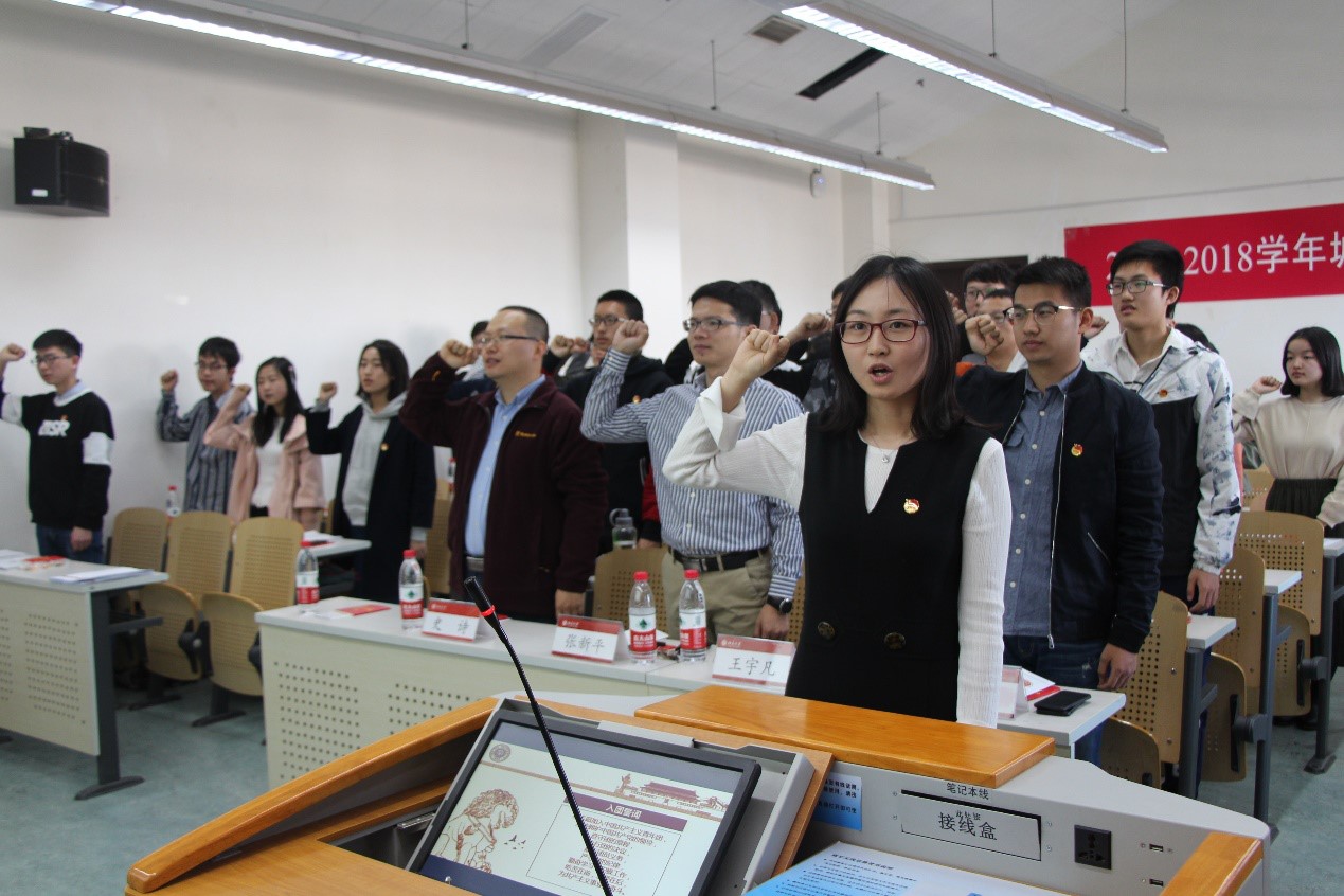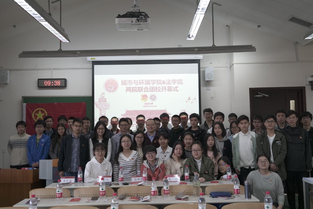 文理优势、取长补短,为团校学员们提供了开拓眼界、增长知识、提升能力的绝佳机会。史老师鼓励同学们认真学习、积极合作,培育两院同学之间深厚的友情,共同加深对共青团的认识与理解。 图三.史诗老师分享 两位老师的讲话受到了同学们的热烈欢迎。接下来,主持人简要介绍了团校的背景和课程设置。随后,在庄严热烈的气氛之中,王宇凡老师带领两院团校学员们重温了入团誓词。铿锵有力的话语,饱含着共青团人的热血与激情。同学们在这短短几行誓词里,体味着和共青团共同成长、共同奋斗的历程,回顾着我们党、我们团光荣的发展历史,更加坚定了不忘初心、牢记使命、坚持不懈、敢为人先的斗争决心和革命理想。 图四.王宇凡老师带领团校学员重温入团誓言 最后,老师与同学们共同观看了由共青团中央出品的教育视频《入团第一课》。通过一对兄妹加入共青团的故事,同学们学习了团的光荣历史、基本知识,领略了团员青年蓬勃向上的生命力和服务社会、服务人民的奉献精神。观看结束后,两院同学进行了充满欢乐的破冰活动。 城环、法院联合团校是在两院团委老师、同学通力合作下举办的一期团校课程。这期团校课程坚持继续落实“三会两制一课”制度,以 “团结、严谨、求实、向上”为其主要建设思想,以“有特色、有思想、有实践、有体悟”为其主要建设目标,力图打通院系隔阂,打破专业限制,丰富同学们的视野,增长同学间相互的认识,通过激发同学们的学习兴趣、交流兴趣和思考兴趣,提升同学们的理论素养和思想认识,进一步深化责任意识、使命意识和大局意识,真正做到“博学、修德、明辨、笃实”,成为新时代的合格共青团员。 图五.团校开幕式合影留恋