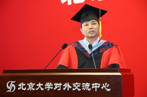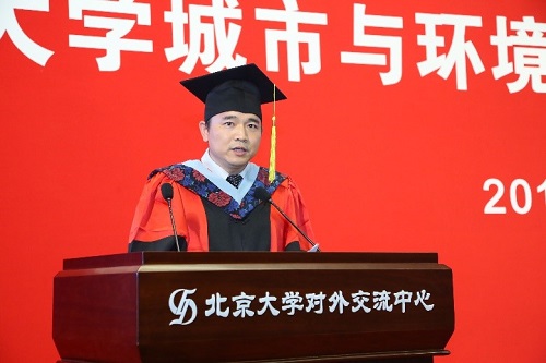 为全体毕业生精心制作的纪念册。翻开册子,一张张笑脸,一幅幅画面,描绘的是圈地为方、绘纸成图的几载青春,诉说的是以诚相待、携手并肩的同窗情谊。 签名墙合影 十四时二十分,典礼在雄壮的国歌中正式开始。院长贺灿飞老师首先致辞。他以未名湖畔的果实为喻,祝贺大家经过辛勤耕耘顺利毕业。他强调了批判性思维、综合性思维、空间思维的重要性,希望大家能够关心自然和人类社会的共同命运,深入开展对资源-环境-生态-城市的综合系统分析,寻找人类之间休戚与共的生存模式以及人类与自然和谐相处的方案。他鼓励大家要特别领会总书记的殷切期望,既要做追梦者,更要做圆梦人,要求真学问,练真本领,努力成为知行合一的实干家,做推动我国生态文明建设的实干家。 院长贺灿飞老师致辞 随后,88级院友、美国纽约州立奥尔巴尼大学地理与规划系教授、奥尔巴尼大学中国文化与经济孔子蜜桃直播