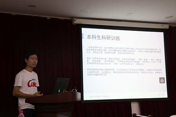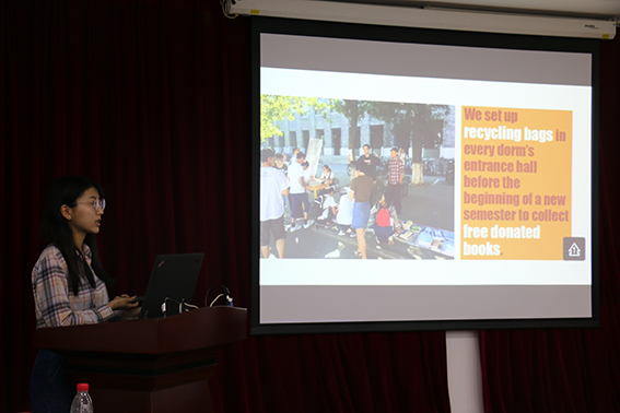 学生代表张志皓同学(中国大学生环境教育基地志愿者)介绍了“林歌”项目在校园废纸、军训衣物回收等方面所做的主要工作;童培峰同学(本科生科研学生代表)介绍了蜜桃直播