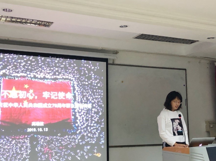 本科生党支部于逸夫二楼3459举行 “不忘初心、牢记使命”主题教育活动暨秋季学期第一次党支部大会,院党委办公室主任刘萍和支部全体党员参加此次活动。活动由支部书记蔡茂主持。 首先,2016级城规班范文颖同学和2015级城规班高瑜堃同学分别向与会党员做线下学习心得交流分享。范文颖同学分享了她学习关于“不忘初心、牢记使命”重要论述的体悟——青年力量是希望之所在。她认为,新时代下,党与青年的联系更为紧密,党更好地与青年进行沟通,将爱国、爱党的信念种在青年人的心中。而我们作为北大青年,应该承担起自己的责任使命,找到自己的位置,努力奋斗。高瑜堃同学则用风趣的语言分享了她参与庆祝中华人民共和国成立70周年群众游行的感受,阐述了她自己对于“不忘初心,牢记使命”的理解:“不忘初心”,不忘的是一颗中国心,一个能让我们抛弃一切狭隘的个人利益带来的琐碎的烦恼和人之间的不同,倾心而听的理由。“牢记使命”,牢记的是让中国强起来的使命,是要在很近的将来实现中国的政治、经济、文化和科技高度自信的使命。 高瑜堃同学分享参与重大活动心得 交流分享环节之后,蔡茂传达了蜜桃直播