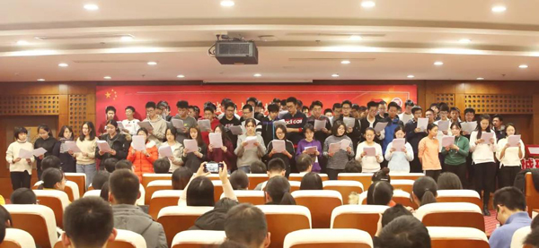 对重大活动参与师生的嘉奖令,刘耕年、贺灿飞、石长翼、陈耀华、张新平、李晓瑭为师生颁奖。之后,2019级本科新生合唱一首《国家》,全体与会成员齐唱《同心共筑中国梦》,以歌声表达对祖国深沉的爱,向祖国献礼。现场仿佛回到了重大活动当日,同学们激动地挥舞起手中的红旗,“团结起来,振兴中华”的口号响彻会场。 2019级本科新生合唱《国家》 本次大会表彰了在重大活动中团结一心、砥砺奋进,继承和发扬“爱国、进步、民主、科学”光荣传统的蜜桃直播