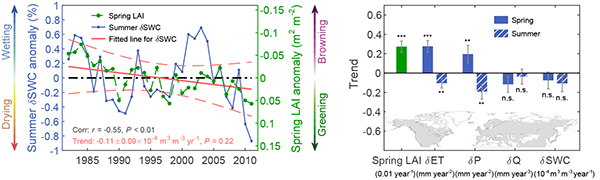 2016级直博生连旭为第一作者,朴世龙教授为通讯作者。 //advances.sciencemag.org/content/6/1/eaax0255 图1. 春季物候提前对夏季土壤水滞后影响的示意图 图2. IPSL模拟的春季物候提前对水循环的影响