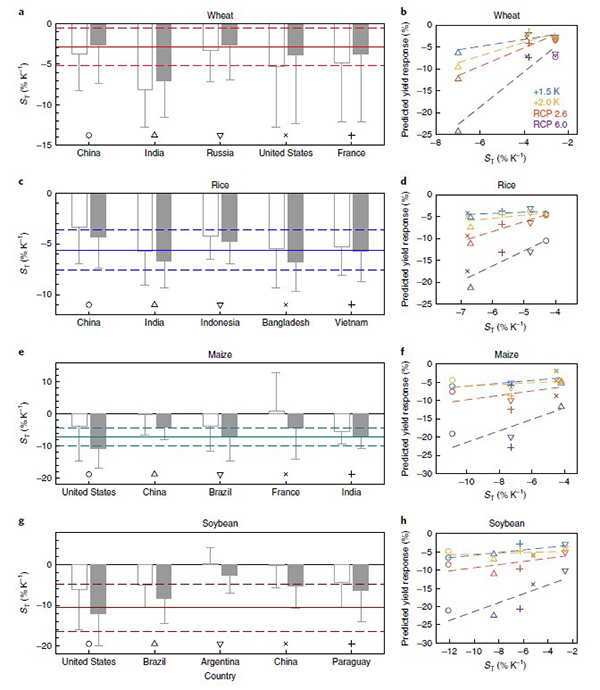 气候变暖对粮食安全的影响是实现可持续发展目标的重要挑战,受到科学界和各国政府的高度关注。然而全球和国家尺度上作物产量对气候变暖的响应仍然存在很大的不确定。以往研究发现不同研究手段估计的气候变暖对全球作物产量的影响的差别可以达到3倍以上,因此政府间气候变化专门委员会(IPCC)的评估报告对气候变暖导致的产量变化只能给出定性的结论。如何提高未来气候变暖对全球作物产量的评估精度是全球变化领域普遍关注的研究热点问题。 王旭辉研究员的研究团队通过设计贝叶斯条件概率统计方法,将全球48个增温实验数据与全球作物模型相结合,重新评估了四种主要粮食作物对气温上升的响应。研究结果表明,1摄氏度的升温将导致小麦、水稻、玉米和大豆分别减产 2.9±2.3%, 5.6±2.0%, 7.1±2.8%和10.6±5.8%。相较于全球作物模型的估计,这一新方法克服了增温实验数量较少空间代表性有限的局限性和作物模型过程和参数的不确定性,将评估精度提高了12%–54%,大幅修正了增温导致全球小麦减产的幅度(较以往研究降低50%)。文章进一步指出,未来气候变暖将导致各主要产粮国的粮食产量普遍降低。但在同样的增温幅度下,美国和印度的作物产量减少幅度将比中国更大(图1)。即便实现《巴黎协定》约定的将全球平均气温较前工业化时期上升幅度控制在2摄氏度,全球四种主要粮食作物仍将减产3%-13%。该研究为推动全球和区域尺度作物模型的完善以及为后《巴黎协定》时期缓解与适应气候变化的政策制定提供了有效的依据。 图1 主要粮食生产国对气温上升的响应 该研究成果以“Emergent constraint on crop yield response to warmer temperature from field experiments”为题发表于《自然—可持续发展》(Nature Sustainability)杂志。蜜桃直播-蜜桃直播app