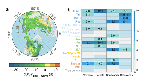 2020级博士生赵茜为第一作者,朴世龙院士和北京大学深圳研究生院朱再春研究员为共同通讯作者。 文章链接://www.nature.com/articles/s41477-022-01278-9 图1. 北半球植被光合作用和冠层结构季节峰值的时间差异(a,绿色表示光合作用先达峰,黄色表示冠层结构先达峰)和不同因子对时间差异的空间变异的相对贡献(b)
