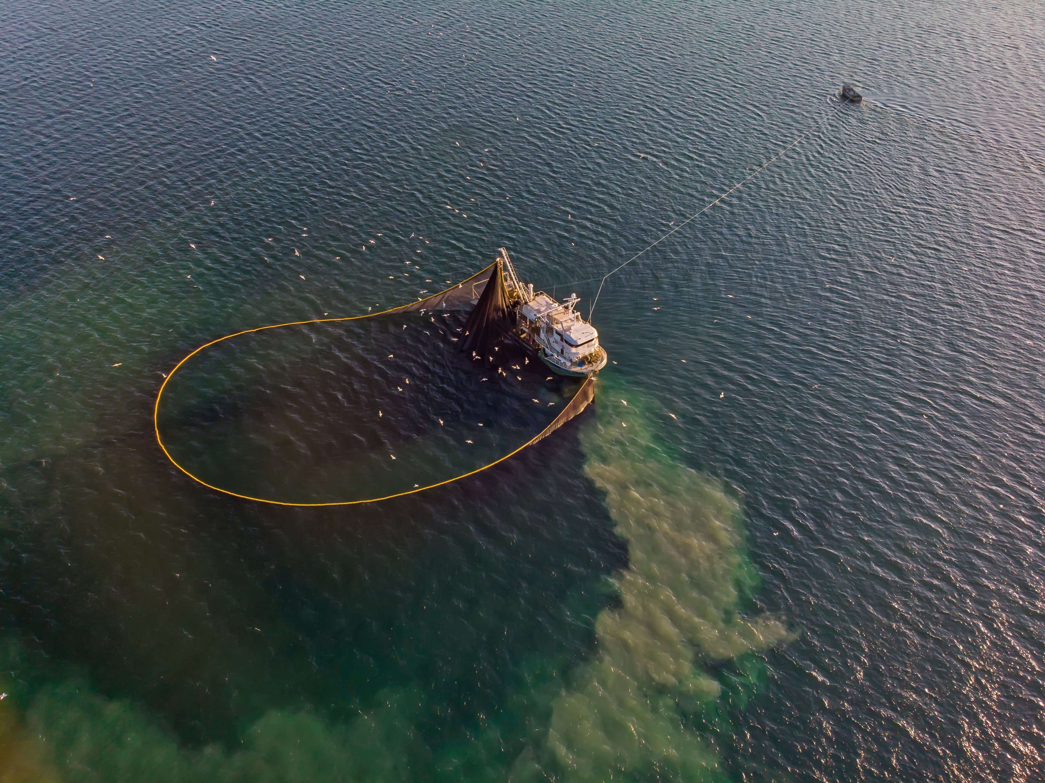 鸟瞰渔船将渔网扔到海里进行拖网捕鱼,土耳其,Tamer Gunal 摄