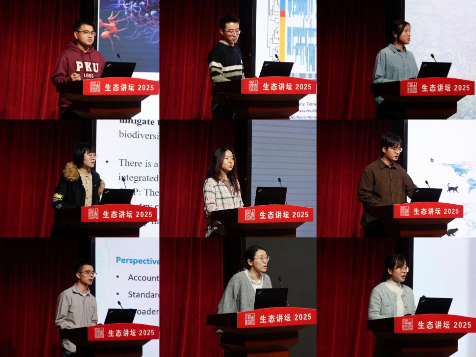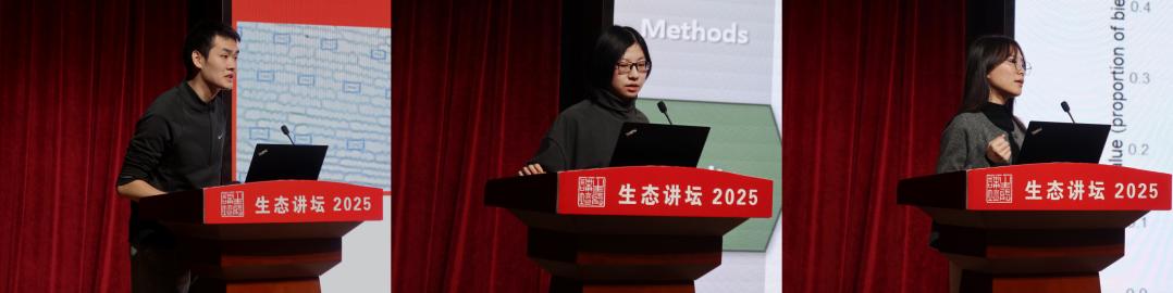 在28日举行的“生态讲坛(博士后、研究生专场)”上,来自北京大学生态研究中心的8名博士后与15名研究生报告了各自的研究成果。会议由张致杰研究员、遇赫研究员、宋珊珊博士和张一帆博士主持。报告内容丰富多元,涵盖微生物群落多样性与构建机制、物种相互作用及感官信息流、生物多样性时空格局与保护、生态建模与遥感监测、作物结构功能建模、人类与动物共栖演化、生态技术开发应用等多个前沿主题;研究方法涵盖野外调查、室内实验、模型模拟、遥感数据分析、深度学习技术应用及分子谱系地理分析等多种手段。经评审团认真评选,彭兰慧、林芮昀、刘梦龙等三位研究生的报告被评为“生态讲坛优秀研究生报告”。