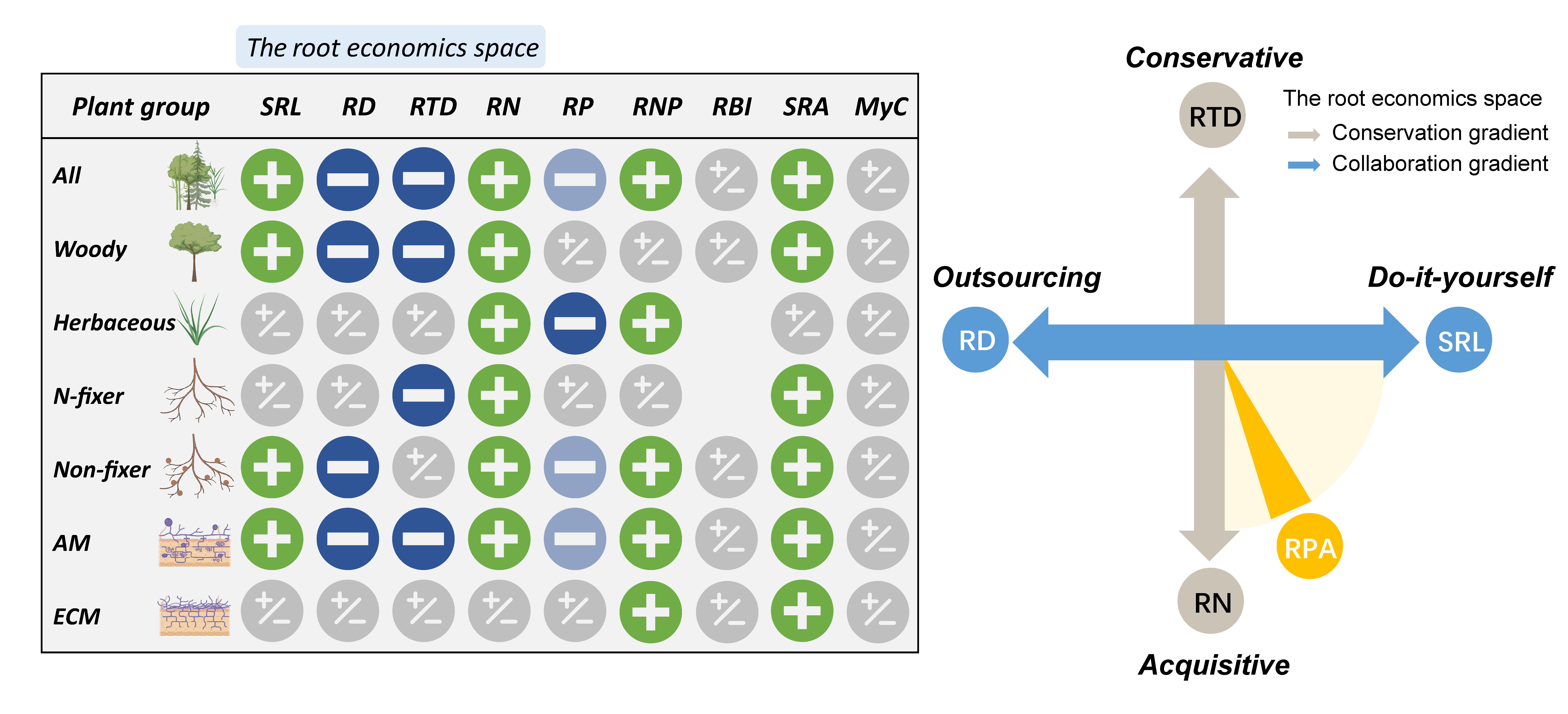 图5 细根磷酸酶活性与其他性状的关系,及其在细根经济空间的位置总结